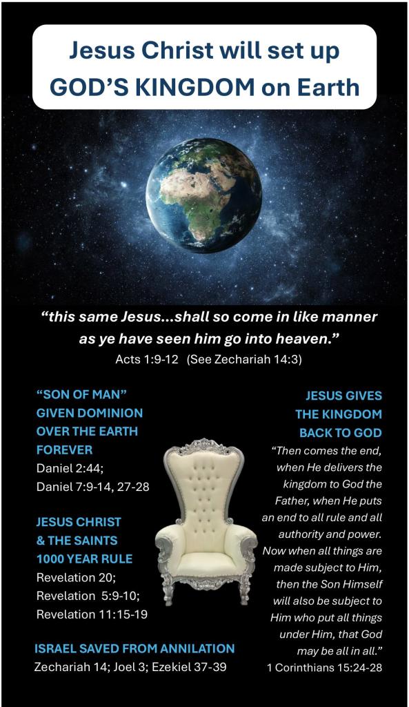 The disciples were clearly in anticipation of a kingdom on earth – and understood it to be the re-establishment of God’s previous kingdom in Israel. Acts 1:6 “Lord, will You at this time restore the kingdom to Israel?” and in verse 11 they are told it will come… “Men of Galilee, why do you stand gazing up into heaven? This same Jesus, who was taken up from you into heaven, will so come in like manner as you saw Him go into heaven.”